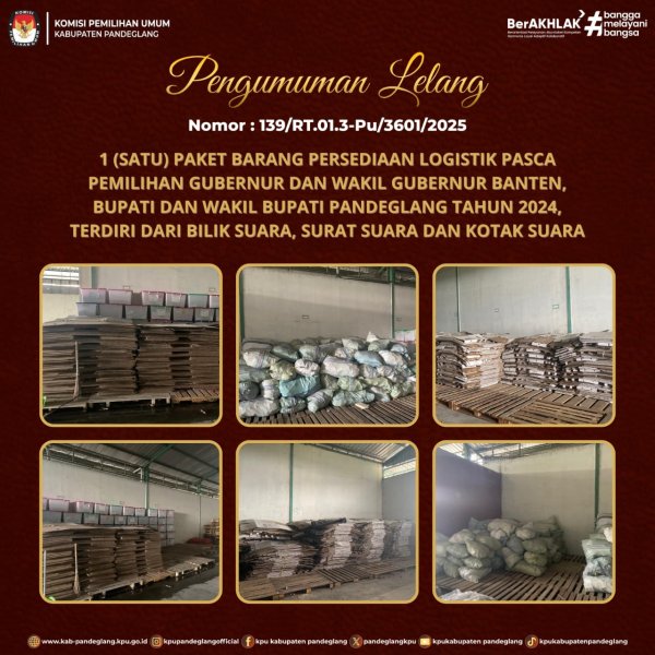 Berdasarkan surat Penetapan Jadwal Lelang Nomor JL-1225/1/KNL.0601/2025 tanggal 7 Agustus 2025 Kantor KPU Kabupaten Pandeglang dengan perantara Kantor Pelayanan Kekayaan Negara dan Lelang (KPKNL) Serang, akan melaksanakan Lelang Barang Milik Negara (BMN) melalui Aplikasi Lelang (Open Bidding) melalui internet (tanpa kehadiran peserta) terhadap objek/barang. Unduh Dokumen Pengumuman Lelang Barang Milik Negara (BMN) melalui Aplikasi Lelang (Open Bidding) berupa 1 (satu) Paket Logistik ex Pemilihan Tahun 2024 ....