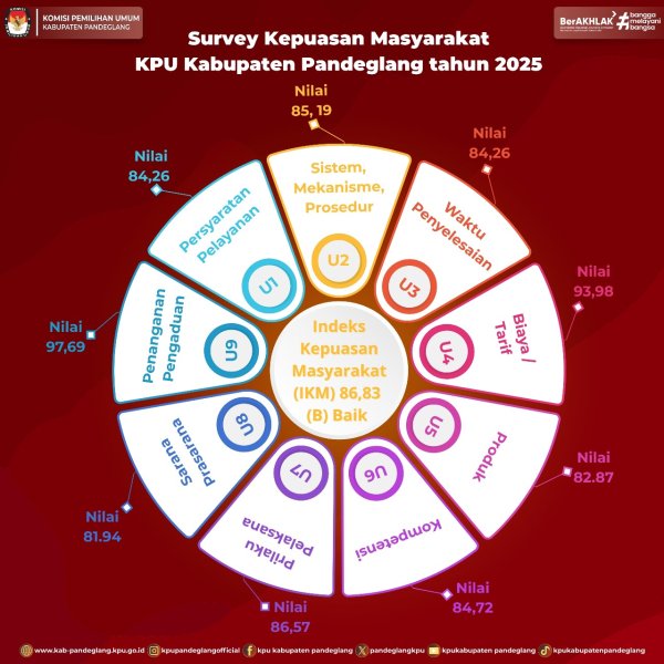 Dari 9 kriteria penilaian kualitas layanan, semua aspek mendapatkan penilaian (B) Baik dan (A) Sangat Baik. Sehingga Indeks Kepuasan Masyarakat (IKM) pada Komisi Pemilihan Umum Kabupaten Pandeglang Tahun 2025 secara keseluruhan mendapatkan nilai 86,83 (B).