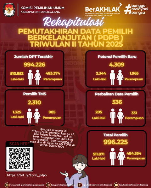 #TemanPemilih, Berikut ini kami sampaikan Hasil Rekapitulasi Pemutakhiran Data Pemilih Berkelanjutan (PDPB)Triwulan II tahun 2025 Tingkat Kabupaten Pandeglang