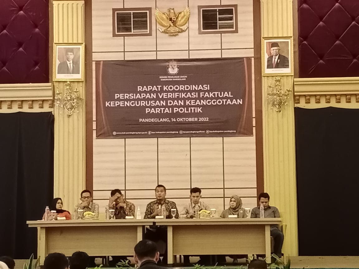 KARANG TANJUNG - Verifikasi Faktual (verfak) kepengurusan dan keanggotaan partai politik (Parpol) calon peserta Pemilu 2024 dilakukan selama 21 hari dari Sabtu hingga Senin (15 Oktober - 4 November 2022). Hal itu sesuai dengan amanah dari Keputusan KPU Nomor 384 Tahun 2022 tentang Perubahan Keempat atas Keputusan KPU Nomor 260 Tahun 2022 tentang Pedoman Teknis Bagi KPU, KPU Provinsi dan KPU Kabupaten/Kota dalam Pelaksanaan Pendaftaran, Verifikasi dan Penetapan Parpol Peserta Pemilu Anggota DPR dan DPRD. Demikian disampaikan Ketua Divisi Teknis Penyelenggaraan KPU Pandeglang Ahmadi dalam Rapat Koordinasi (Rakoor) Persiapan Verfak Kepengurusan dan Keanggotaan Partai Politik Calon Peserta Pemilu 2024 di Hotel Horison Altama Kecamatan Karang Tanjung, Jumat (14/10/2022). Hadir dalam kegiatan tersebut para Komisioner, Sekretaris dan staf sekretariat KPU Pandeglang, Anggota KPU Banten Ramelan, Bawaslu Pandeglang, unsur Muspida dan perwakilan Parpol di Pandeglang. Dikatakan Ahmadi, dalam verfak kepengurusan Parpol, pihaknya akan mengecek pengurus Dewan Pimpinan Cabang (DPC) tingkat kabupaten atau sebutan lain dan data alamat kantor sesuai yang disampaikan Dewan Pimpinan Pusat (DPP) Parpol yang bersangkutan lewat Sistem Informasi Parpol (Sipol). Sedangkan verfak keanggotaan dilakukan dengan mendatangi satu persatu anggota Parpol ke alamat kediamannya sesuai dengan data cuplik yang ada di Sipol. "Mekanisme verfak keanggotaan ada tiga tahap yakni didatangi, jika tidak bisa ditemui, dikumpulkan oleh LO (tim penghubung) di sekretariat Parpol atau lokasi yang disetujui dan dilakukan video call jika anggota Parpol yang bersangkutan tidak hadir," kata Ahmadi. Sebelum melakukan verfak, KPU Pandeglang, kata Ahmadi, berkoordinasi dengan Bawaslu dan Parpol yang akan didatangi. "Pada saat kami verfak tentu didampingi oleh Bawaslu Pandeglang," ujarnya. Ketua KPU Pandeglang Ahmad Suja'i menyampaikan, jumlah Parpol yang akan dilakukan verfak kepengurusan dan keanggotaan sebanyak sembilan Parpol diantaranya Partai Persatuan Indonesia (Perindo), Partai Bulan Bintang (PBB), Partai Kebangkitan Nusantara (PKN), Partai Hati Nurani Rakyat (Hanura), Partai Buruh, Partai Ummat, Partai Gelombang Rakyat Indonesia (Gelora), Partai Solidaritas Indonesia (PSI) dan Partai Garda Perubahan Indonesia (Garuda). Sembilan Parpol itu sesuai yang diumumkan KPU RI. "Yang lolos diumumkan KPU RI sebanyak 18 Parpol, namun yang sembilan Parpol tidak diverfak karena mereka adalah Parpol parlemen. Ini sesuai dengan putusan MK Nomor 55/PUU-XVIII/2020," tegasnya. (*)