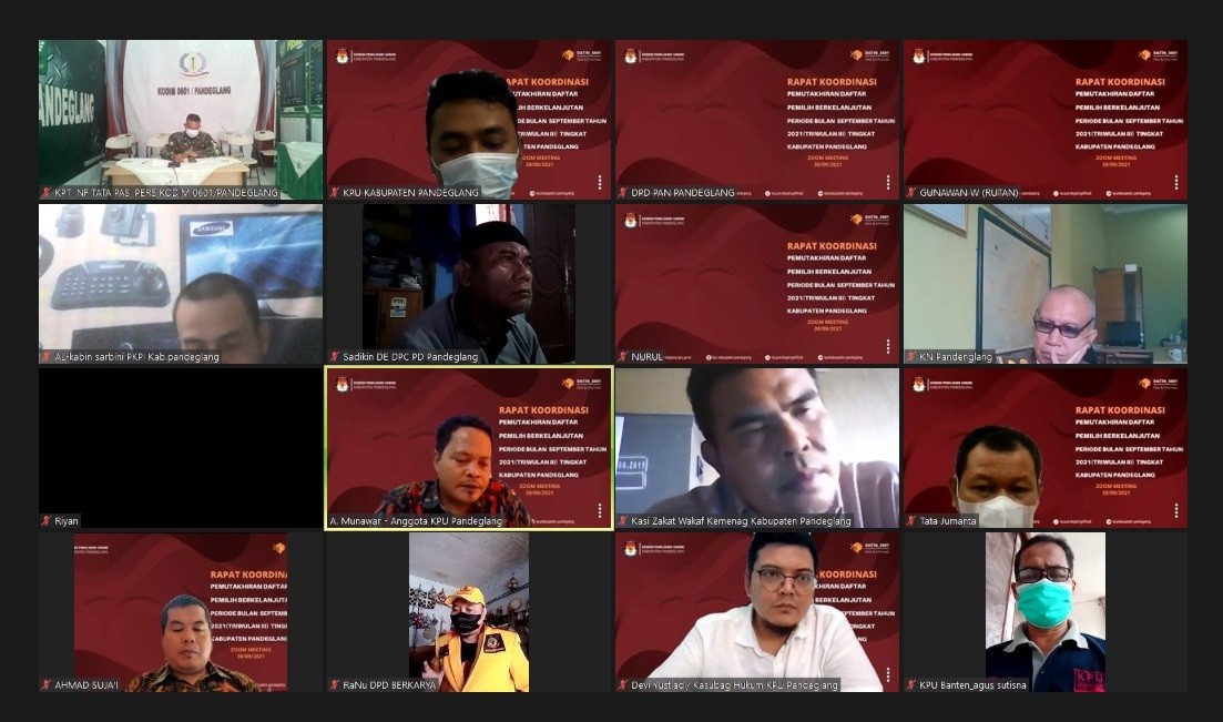 Pandeglang, (30/09/2021) – KPU Kabupaten Pandeglang menggelar Rapat Koordinasi Rekapitulasi Pemutakhiran Daftar Pemilih Berkelanjutan Periode September Tahun 2021 dengan metode daring dengan media zoom cloud meeting. Peserta hadiri oleh Bawaslu Kabupaten Pandeglang, Instansi/Lembaga Pemerintah Terkait, dan Partai Politik Tingkat Kabupaten Pandeglang. Rakoor dibuka oleh Ahmad Suja’i Ketua KPU Kabupaten Pandeglang sekaligus memberikan sambutan dalam acara tersebut, “rapat koordinasi ini bagian upaya KPU Kabupaten Pandeglang dalam proses memutakhirkan data pemilih secara berkelanjutan untuk menjadi suatu bahan proses pemutakhiran data pemilih pada Pemilu/Pemilihan berikutnya” ujar Ahmad Suja’i. Rakoor ini di pimpin langsung A. Munawar selaku Anggota KPU Kabupaten Pandeglang Divisi Data dan Informasi mengatakan bahwa pelaksanaan Rakoor Rekapitulasi Daftar Pemilih Berklanjutan ini dilaksanakan setiap bulan dengan mekanisme per-triwulan mengundang lembaga/instansi pemerintah terkait dan partai politik tingkat Kabupaten Pandeglang. “gelaran rakoor hari ini sudah memasuki proses pemutakhiran daftar pemilih berkelanjutan periode triwulan III dengan mengundang pihak luar, dan sudah dilakukan pula pada bulan-bulan sebelumnya yaitu rakoor pada triwulan I bulan Maret tahun 2021 dan pada triwulan II bulan Juni tahun 2021” tutur A. Munawar. A. Munawar menambahkan pula bahwa proses pemutakhiran data pemilih berkelanjutan ini pasti merupakan suatu kewajiban yang harus dilaksanakan oleh jajaran KPU Kabupaten Pandeglang guna melayani beberapa masukan dan tanggapan masyarakat terhadap pelaksanaan pemutakhiran daftar pemilih berkelanjutan. “Pada proses pemenuhan data sebagai ikhtiar memutakhirkan daftar pemilih berkelanjutan tersebut masih mengalami beberapa kendala, akan tetapi hal tersebut dapat diatasi dengan upaya membuka layanan pengaduan, Layanan pengaduan tersebut sebagai upaya masyarakat ikut serta memberikan tanggapan dan masukan terhadap proses kegiatan pemutakhiran daftar pemilih berkelanjutan, baik menyampaikan potensi pemilih baru, TMS, perbaikan data, dapat pula disampaikan secara fisik administrasi maupun secara online” tambahnya Berdasarakan Berita Acara KPU Kabupaten Pandeglang Nomor : 11/PL.01.1-BA/KPU-Kab/IX/2021 Tentang Rapat Koordinasi Pemutakhiran Daftar Pemilih Berkelanjutan Tahun 2021 Periode Bulan September Tingkat Kabupaten Pandeglang sejumlah 906.585 Pemilih dengan rincian Pemilih Laki-laki sejumlah 465.721 Pemilih dan Pemilih Perempuan sejumlah 440.864 Pemilih yang tersebar di 35 Kecamatan se-Kabupaten Pandeglang. (MA/Humas_KPU_Pdg)