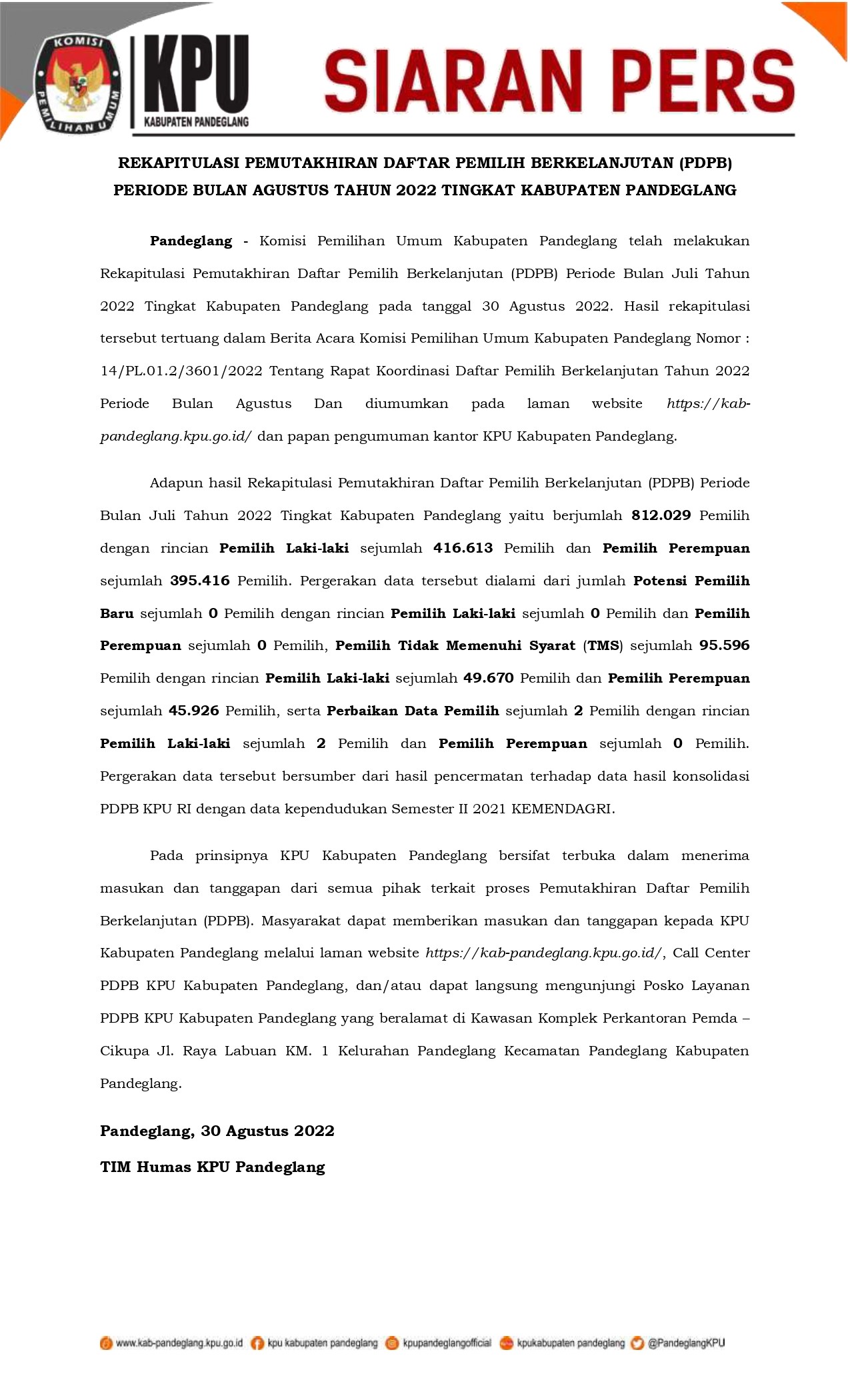 PENGUMUMAN NOMOR : 274/PP.04.1.Pu/36012022 TENTANG SELEKSI CALON ANGGOTA PANITIA PEMILIHAN KECAMATAN (PPK) UNTUK PEMILIHAN UMUM TAHUN 2024 Dalam rangka pembentukan Panitia Pemilihan Kecamatan untuk Pemilihan Umum Serentak Tahun 2024, Komisi Pemilihan Umum Kabupaten Pandeglang mengundang Warga Negara Indonesia yang memenuhi persyaratan untuk mendaftarkan diri menjadi anggota Panitia Pemilihan Kecamatan untuk Pemilihan Umum Serentak Tahun 2024 dengan ketentuan sebagai berikut: Persyaratan Anggota PPK a. Warga Negara Indonesia; b. berusia paling rendah 17 (tujuh belas) tahun; c. setia kepada Pancasila sebagai dasar Negara, Undang-Undang Dasar Negara Republik Indonesia Tahun 1945, Negara Kesatuan Republik Indonesia, Bhinneka Tunggal Ika, dan cita-cita Proklamasi 17 Agustus 1945; d. mempunyai integritas, pribadi yang kuat, jujur dan adil; e. tidak menjadi anggota Partai Politik yang dinyatakan dengan surat pernyataan yang sah, atau sekurang-kurangnya 5 (lima) tahun tidak lagi menjadi anggota partai politik yang dibuktikan dengan surat keterangan dari pengurus partai politik yang bersangkutan; f. berdomisili dalam wilayah kerja PPK; g. mampu secara jasmani, rohani, dan bebas dari penyalahgunaan narkotika; h. berpendidikan paling rendah sekolah menengah atas atau sederajat; dan i. tidak pernah dipidana penjara berdasarkan putusan pengadilan yang telah memperoleh kekuatan hukum tetap karena melakukan tindak pidana yang diancam dengan pidana penjara 5 (lima) tahun atau lebih. Kelengkapan Dokumen Persyaratan: a. Surat pendaftaran sebagai calon anggota PPK; b. Fotokopi Kartu Tanda Penduduk Elektronik; c. Fotokopi ijazah sekolah menengah atas/sederajat atau ijazah terakhir; d. Surat pernyataan dalam satu dokumen yang menyatakan : 1. setia kepada Pancasila sebagai dasar Negara, Undang-Undang Dasar Negara Republik Indonesia Tahun 1945, Negara Kesatuan Republik Indonesia, Bhinneka Tunggal Ika, dan cita-cita Proklamasi 17 Agustus 1945; 2.tidak menjadi anggota Partai Politik; 3. bebas dari penyalahgunaan narkotika; 4. tidak pernah dipidana penjara berdasarkan putusan pengadilan yang telah memperoleh kekuatan hukum tetap karena melakukan tindak pidana yang diancam dengan pidana penjara 5 (lima) tahun atau lebih; 5. tidak pernah dijatuhi sanksi pemberhentian tetap oleh KPU Kabupaten/Kota atau Dewan Kehormatan Penyelenggara Pemilu; 6. tidak menjadi tim kampanye atau tim pemenangan atau saksi peserta Pemilu atau Pemilihan pada penyelenggaraan Pemilu dan Pemilihan paling singkat dalam 5 (lima) tahun terakhir; 7. tidak berada dalam ikatan perkawinan dengan sesama penyelenggara Pemilu; 8. tidak memiliki penyakit penyerta (komorbiditas); 9. mempunyai kemampuan dan kecakapan dalam membaca, menulis dan berhitung; dan 10. mampu mengoperasikan perangkat teknologi informasi. e. Surat keterangan dari partai politik yang bersangkutan bagi calon yang paling singkat 5 (lima) tahun tidak lagi menjadi anggota Partai Politik; f. Surat keterangan sehat jasmani dan rohani yang dikeluarkan oleh puskesmas, rumah sakit, atau klinik yang termasuk di dalamnya terdapat pemeriksaan tekanan darah, kadar gula darah, dan kolesterol; g. Daftar Riwayat Hidup; h. Pas Foto Berwarna 4x6; dan Surat Pendaftaran dan kelengkapan dokumen disampaikan kepada KPU Kabupaten Pandeglang sejak tanggal 20 November 2022 sampai dengan tanggal 29 November 2022 Pukul 16.00 WIB, melalui: a. https://siakba.kpu.go.id dan dokumen fisik yang disampaikan pada saat sebelum pelaksanaan seleksi tertulis; atau b. Petugas Pendaftaran di Kantor Sekretariat KPU Kabupaten Pandeglang Alamat : Kantor KPU Kabupaten Pandeglang ((Jalan Raya Labuan Km. 1 Kawasan Perkantoran Pemda-Cikupa) Kontak : Hp. 081268137458 (Destiana) atau Hp. 087779033330 (Devi Yustiadi) Waktu : Pukul 08.00 – 16.00 WIB Demikian pengumuman ini disampaikan, untuk diketahui. PENGUMUMAN SELEKSI CALON ANGGOTA PANITIA PEMILIHAN KECAMATAN (PPK) UNTUK PEMILIHAN UMUM TAHUN 2024 SURAT PENDAFTARAN SEBAGAI CALON ANGGOTA PPK SURAT PERNYATAAN CALON ANGGOTA PPK DAFTAR RIWAYAT HIDUP CALON ANGGOTA PPK