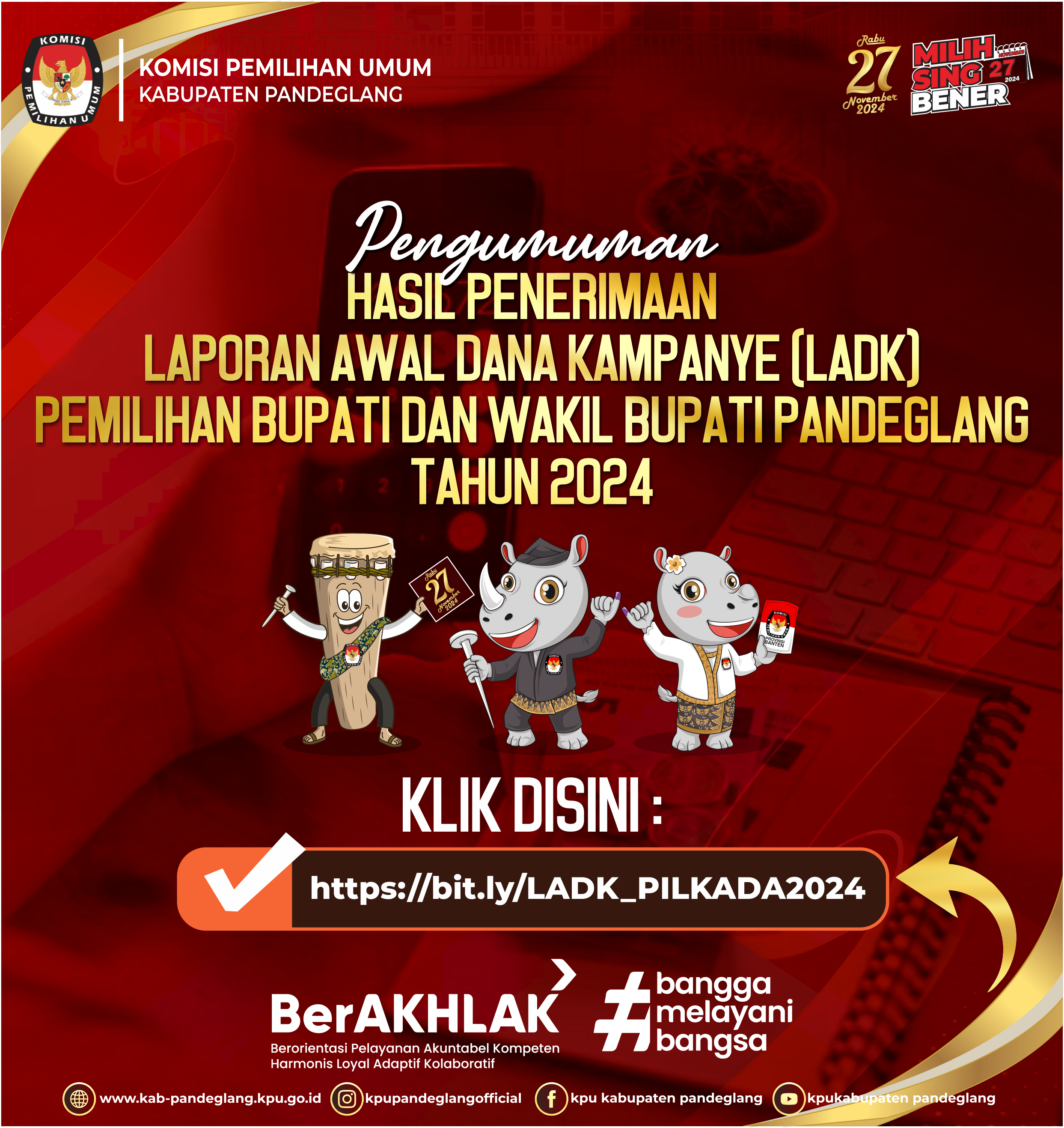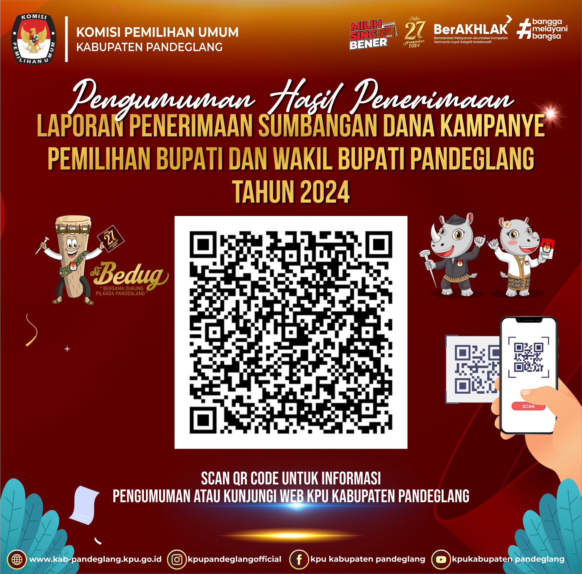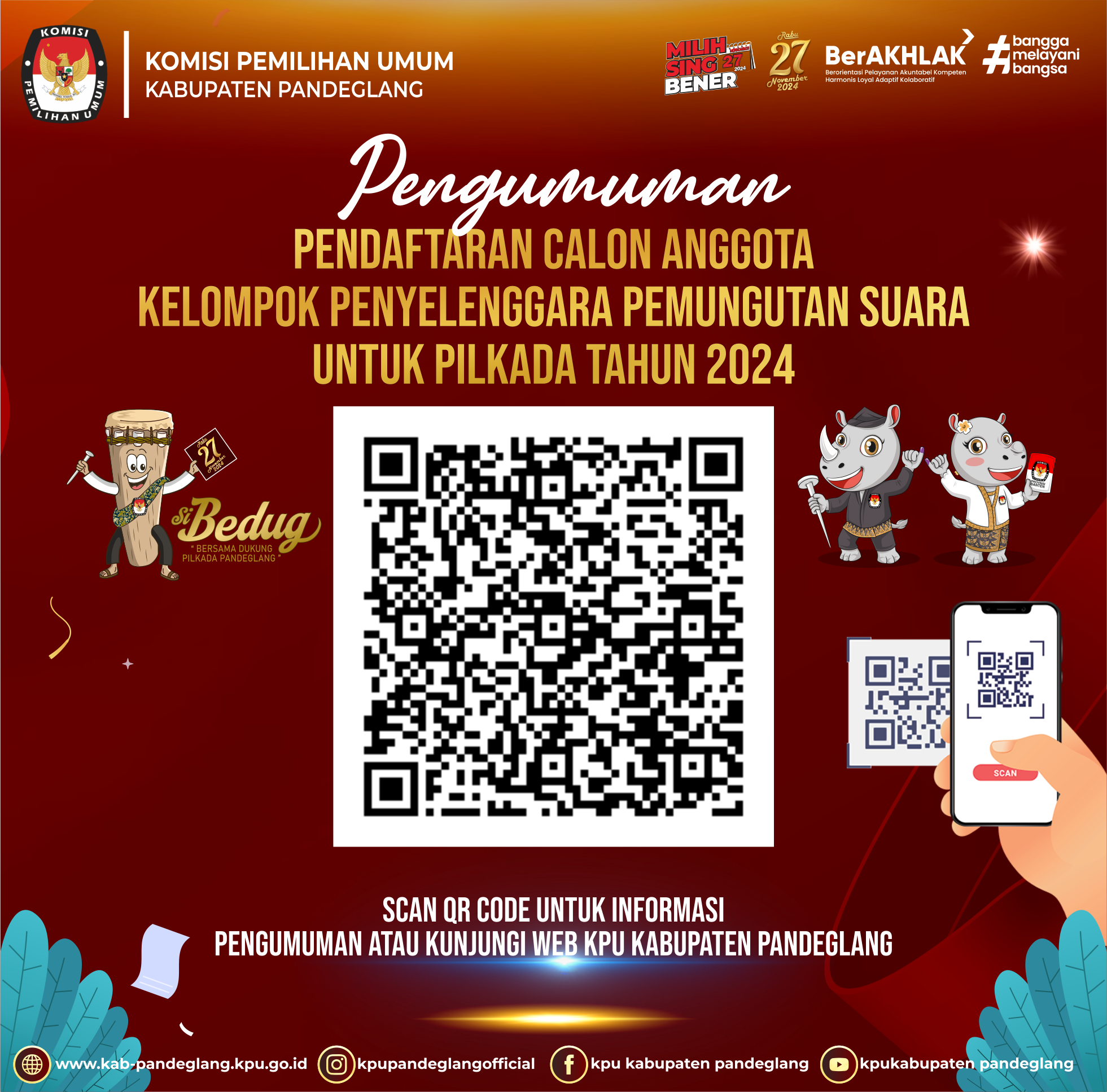 Dalam rangka pembentukan KPPS untuk Pemilihan Gubernur dan Wakil Gubernur, Bupati dan Wakil Bupati, dan Wali Kota dan Wakil Wali Kota Tahun 2024, Komisi Pemilihan Umum Kabupaten Pandeglang mengundang Warga Negara Indonesia yang memenuhi persyaratan untuk mendaftarkan diri menjadi anggota KPPS untuk Pemilihan Gubernur dan Wakil Gubernur, Bupati dan Wakil Bupati, dan Wali Kota dan Wakil Wali Kota Tahun 2024, Komisi Pemilihan Umum Kabupaten Pandeglang dengan ketentuan sebagai berikut: