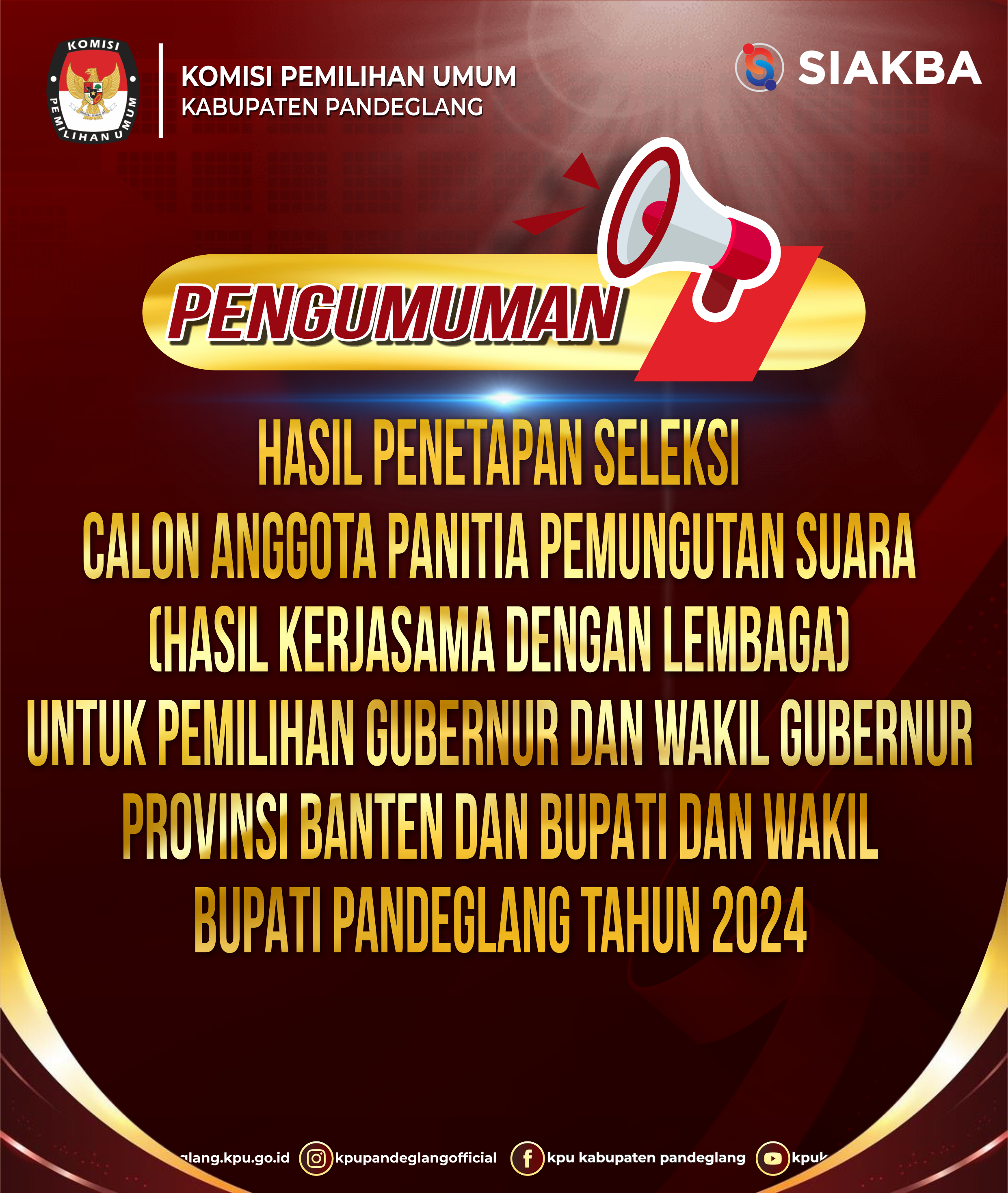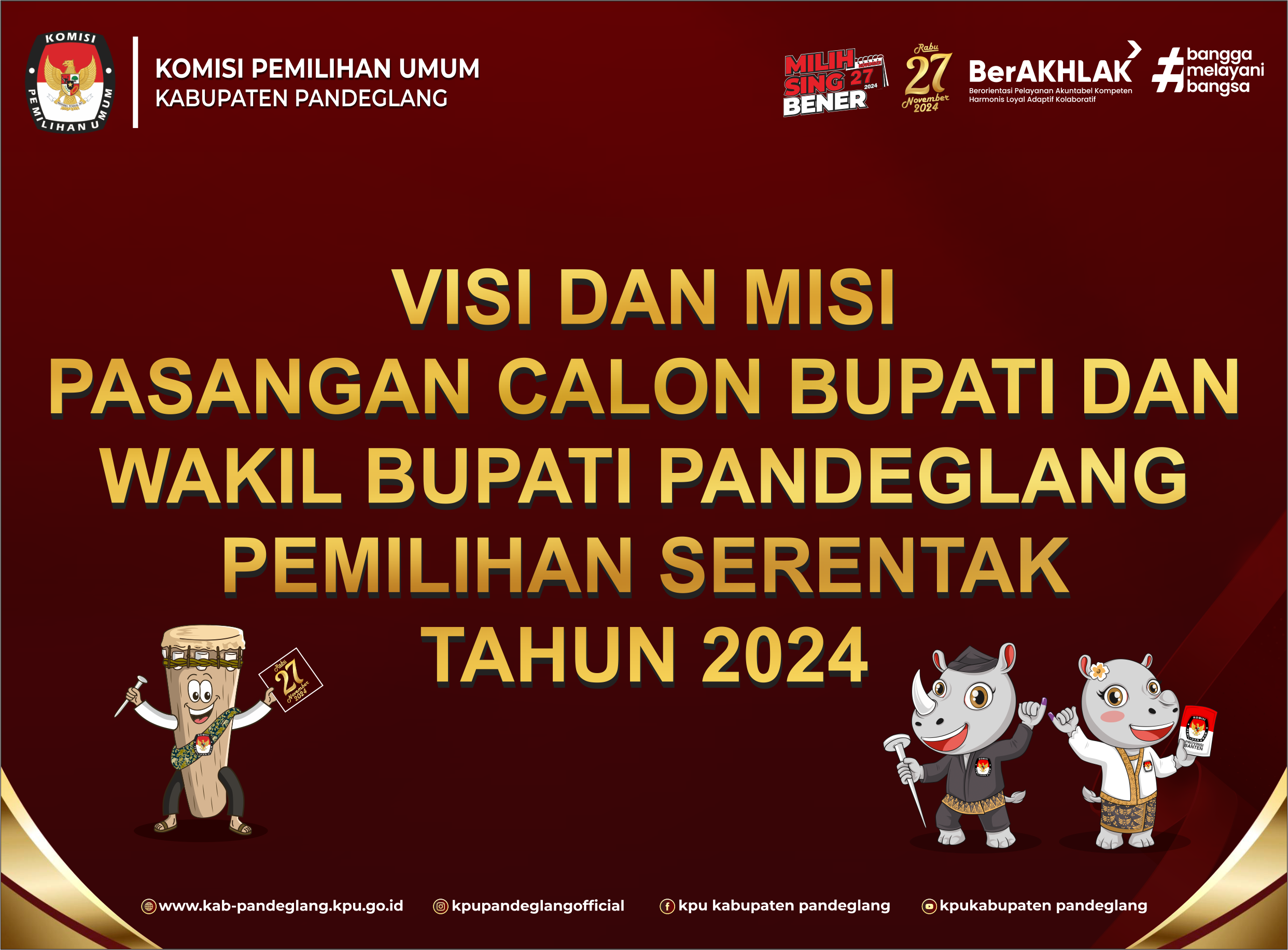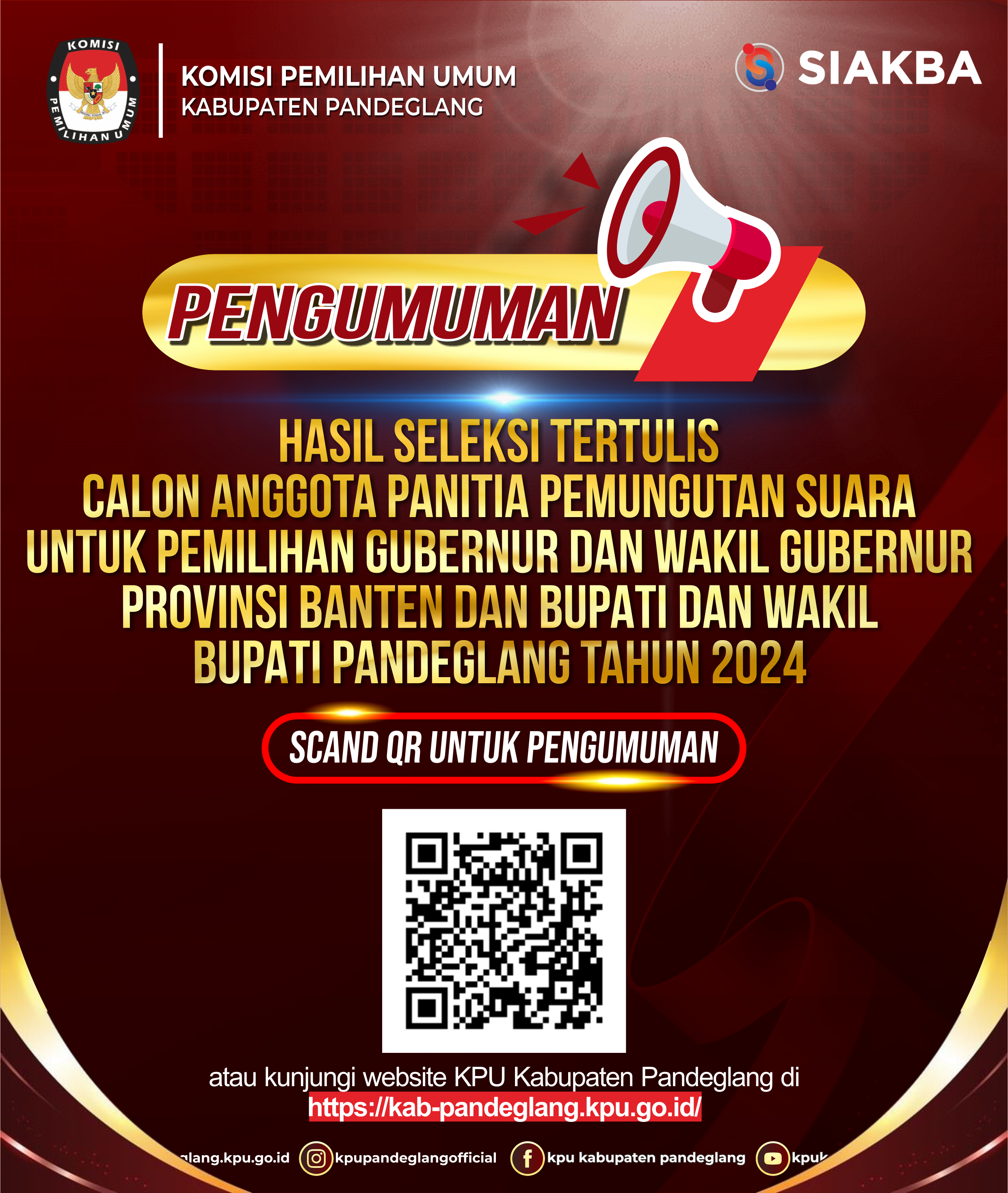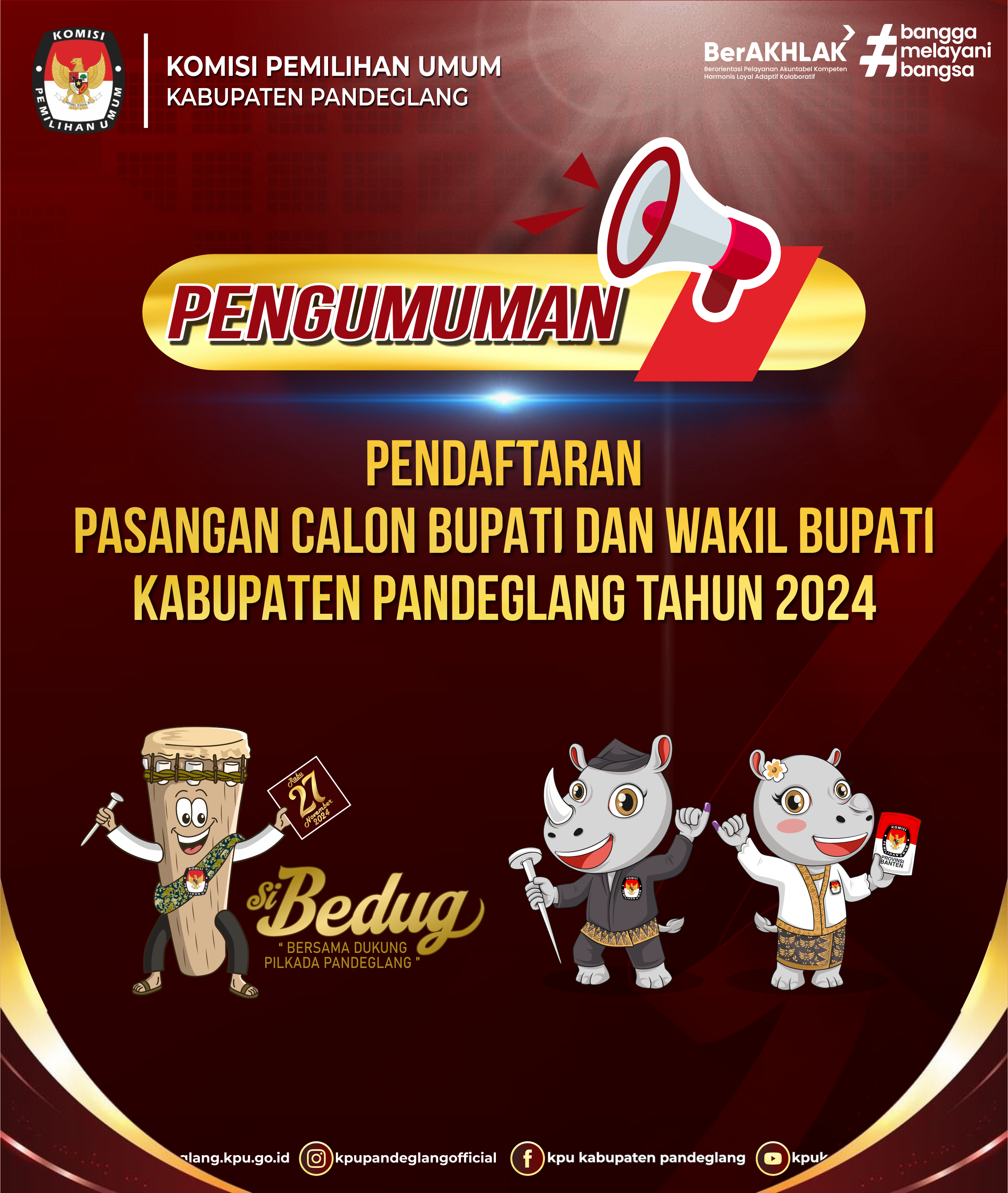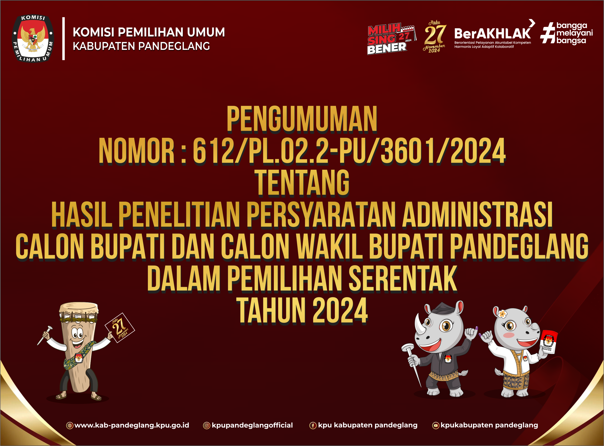 Bahwa untuk melaksanakan ketentuan Peraturan Komisi Pemilihan Umum Nomor 2 Tahun 2024 tentang Tahapan, Program, dan Jadwal Pemilihan Gubernur dan Wakil Gubernur, Bupati dan Wakil Bupati, serta Walikota dan Wakil Walikota Tahun 2024, dan Pasal 102 ayat (2) dan Pasal 137 Peraturan Komisi Pemilihan Umum Nomor 8 Tahun 2024 tentang Pencalonan Gubernur dan Wakil Gubernur, Bupati dan Wakil Bupati, serta Walikota dan Wakil Walikota, sebagaimana telah diubah dengan Peraturan Komisi Pemilihan Umum Nomor 10 Tahun 2024, serta BAB VII Keputusan Komisi Pemilihan Umum Nomor 1229 Tahun 2024 tentang Pedoman Teknis Pendaftaran, Penelitian Persyaratan Administrasi Calon, Dan Penetapan Pasangan Calon Dalam Pemilihan Gubernur Dan Wakil Gubernur, Bupati dan Wakil Bupati, serta Walikota dan Wakil Walikota, Komisi Pemilihan Umum Kabupaten Pandeglang mengumumkan hasil penelitian persyaratan administrasi calon Bupati dan Wakil Bupati Pandeglang dalam Pemilihan Serentak Tahun 2024 sebagai berikut : Unduh : PENGUMUMAN TENTANG HASIL PENELITIAN PERSYARATAN ADMINISTRASI CALON BUPATI DAN CALON WAKIL BUPATI PANDEGLANG DALAM PEMILIHAN SERENTAK TAHUN 2024