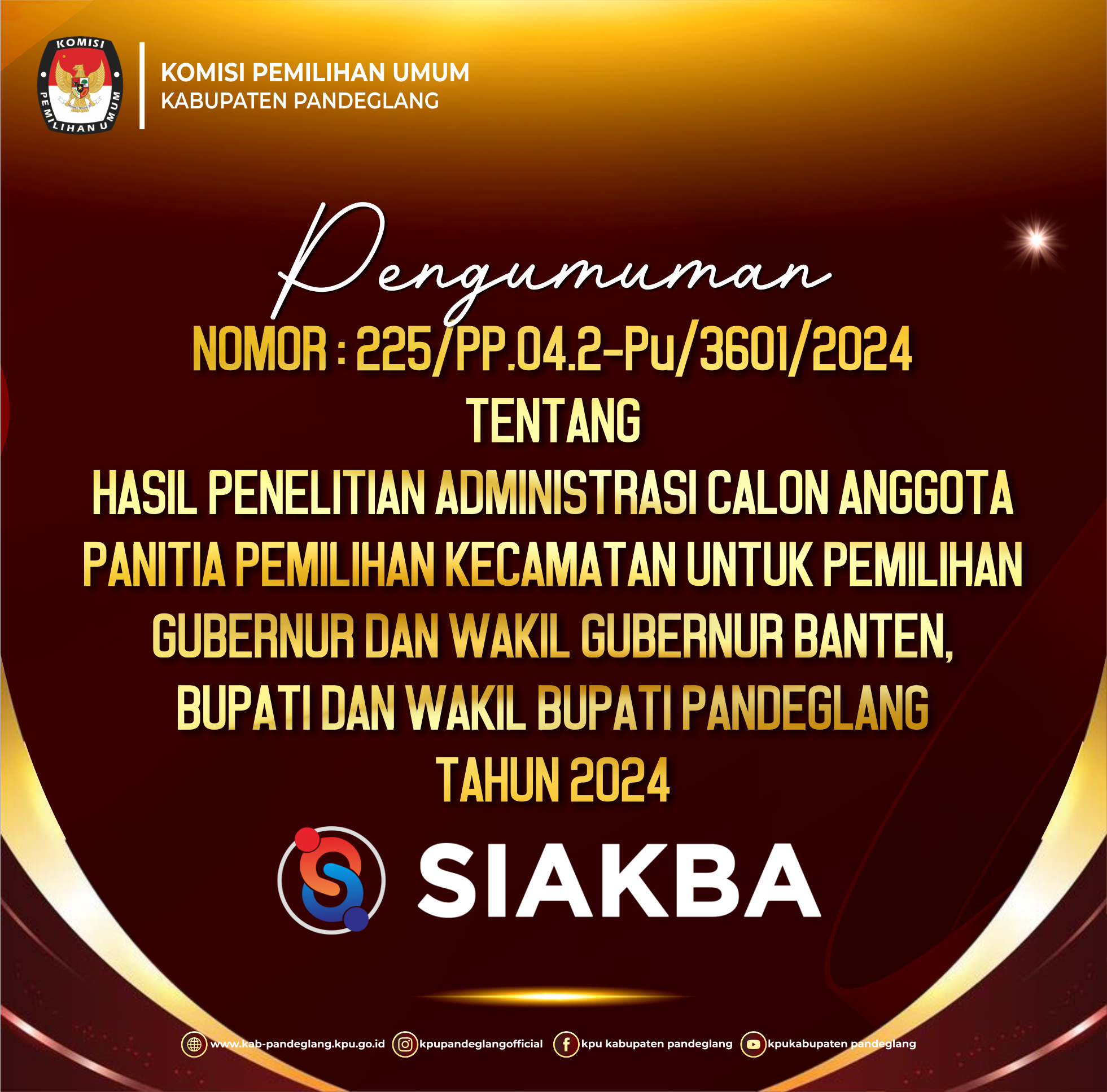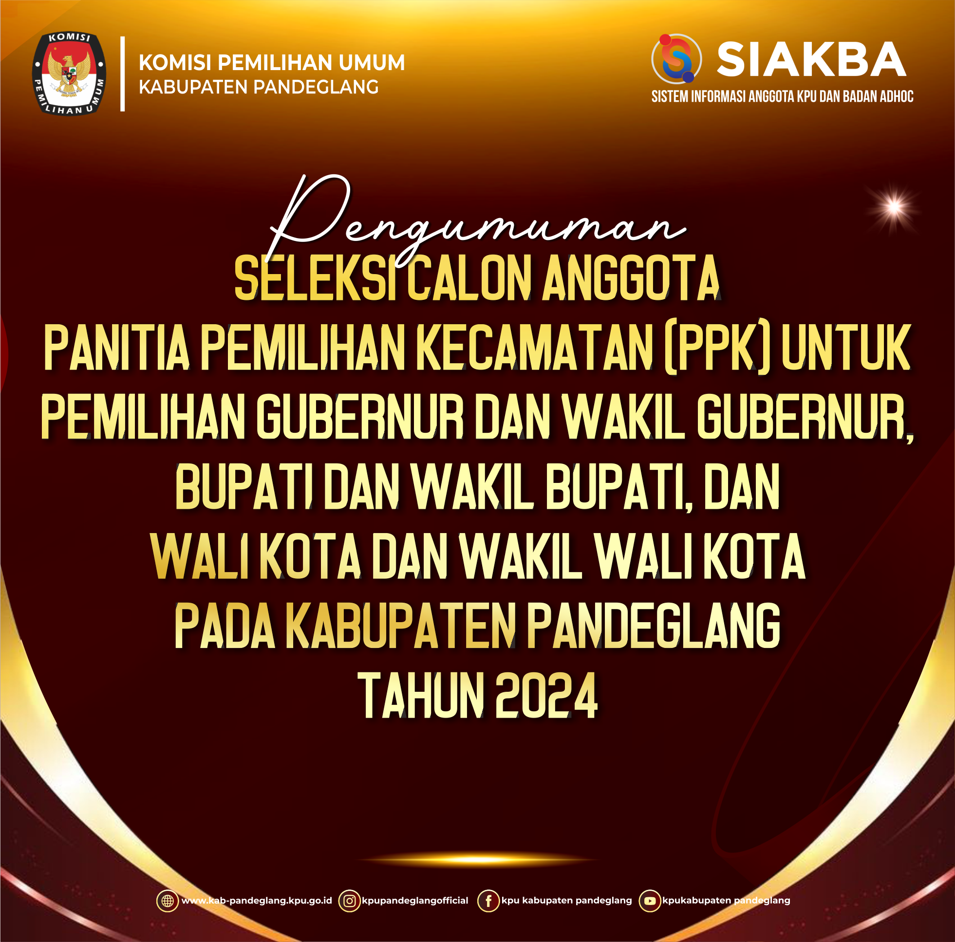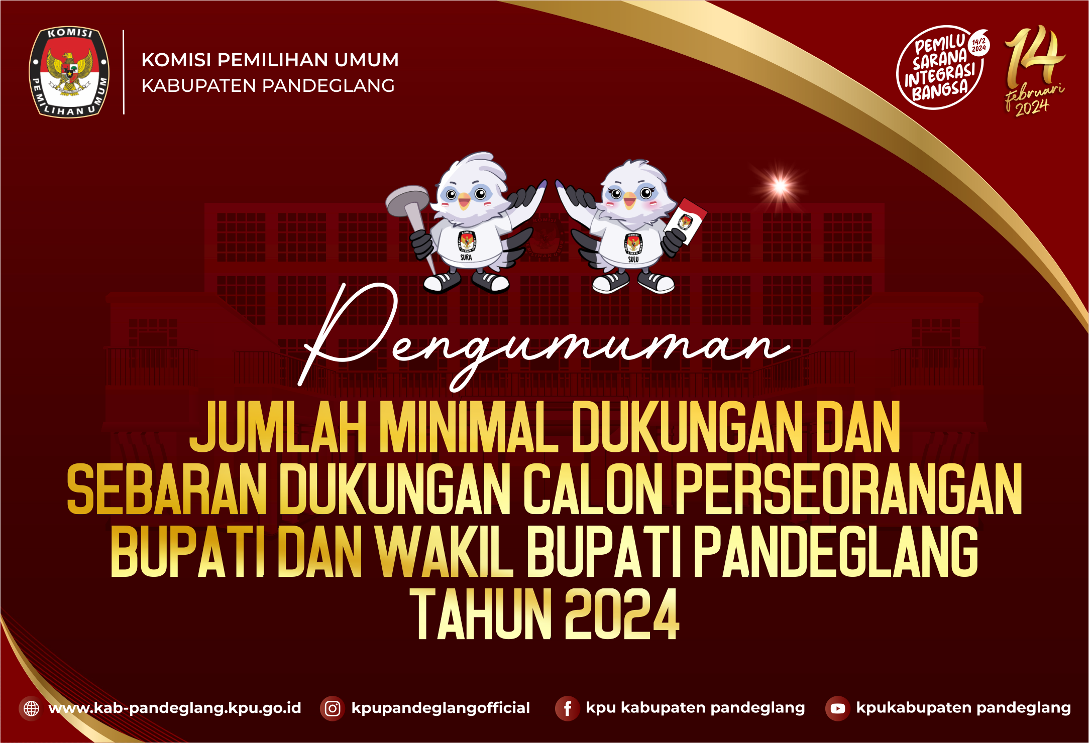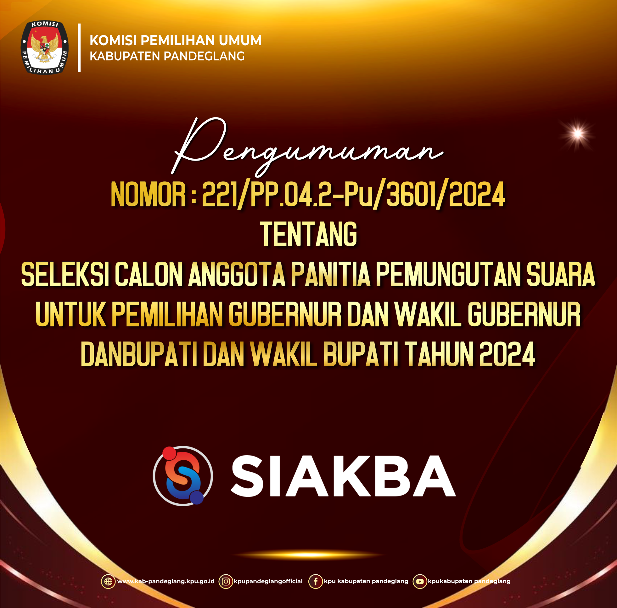 Dalam rangka pembentukan Calon Anggota Panitia Pemungutan SuarauntukPemilihan Gubernur dan Wakil Gubernur dan Bupati dan Wakil Bupati Tahun2024, Komisi Pemilihan Umum Kabupaten Pandeglang mengundangWargaNegara Indonesia yang memenuhi kualifikasi untuk mendaftarkandiri menjadi Panitia Pemungutan Suara untuk Pemilihan Gubernur dan Wakil Gubernurdan Bupati dan Wakil Bupati Tahun 2024 dengan ketentuan sebagai berikut: Persyaratan Anggota Panitia Pemungutan Suara : a. Warga Negara Indonesia. b. berusia paling rendah 17 (tujuh belas) tahun bagi PPS. c. setia kepada Pancasila sebagai dasar Negara, Undang-UndangDasarNegara Republik Indonesia Tahun 1945, Negara KesatuanRepublikIndonesia, Bhinneka Tunggal Ika, dan cita-cita Proklamasi 17 Agustus1945. d. mempunyai integritas, pribadi yang kuat, jujur dan adil. e. tidak menjadi anggota partai politik, atau tidak lagi menjadi anggotapartai politik paling singkat 5 (lima) tahun. f. berdomisili dalam wilayah kerja PPS. g. mampu secara jasmani, rohani, dan bebas dari penyalahgunaannarkotika. h. berpendidikan paling rendah sekolah menengah atas atau sederajat. i. tidak pernah dipidana penjara berdasarkan putusan pengadilanyangtelahmemperoleh kekuatan hukum tetap karena melakukan tindak pidanayangdiancam dengan pidana penjara 5 (lima) tahun atau lebih. PENGUMUMAN NOMOR : 221/PP.04.2-Pu/3601/2024 TENTANG SELEKSI CALON ANGGOTA PANITIA PEMUNGUTAN SUARA UNTUK PEMILIHAN GUBERNUR DAN WAKIL GUBERNURDANBUPATI DAN WAKIL BUPATI TAHUN 2024 UNDUH FORMULIR PENDAFTARAN, DAFTAR RIWAYAT HIDUP DAN SURAT PERNYATAAN